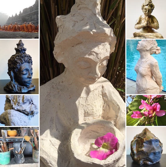 Wie ich auf den „Ton“ gekommen bin: In Asien sieht man unglaublich viele Buddha- Skulpturen. Man sagt, dass man sein Buddha nicht sucht sondern findet. Die industriell gefertigten Skulpturen haben mich nie angesprochen. In den Tempeln und Pagoden, an den verwunschenen Orten, wo die Natur sich die über 400 Jahre alte Baukunst zurückholt, da ist es magisch. Handgefertigte Reliefe und Skulpturen. Nicht perfekt, weil das Wetter und die Zeit sie verändert und darüber hinaus mit einer wunderschönen natürlichen Patina überzogen haben.