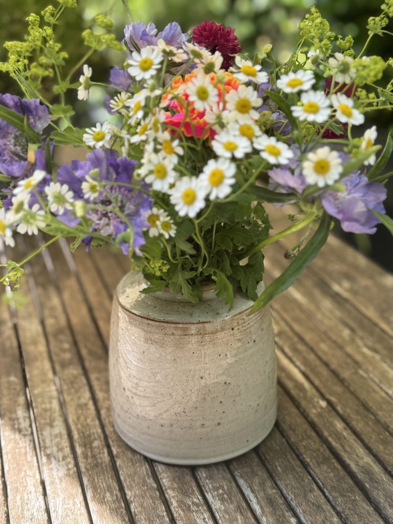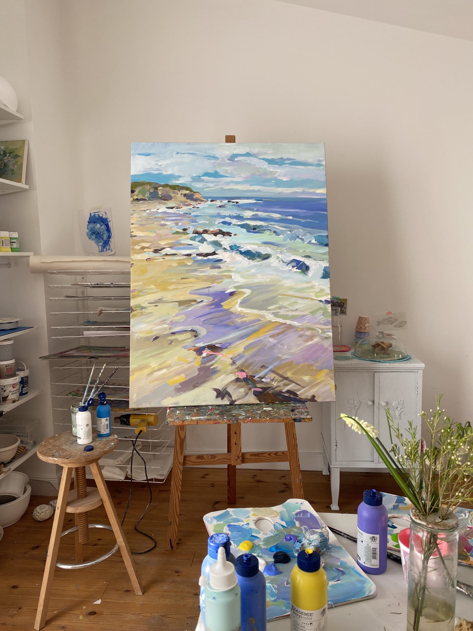 Ich lasse mich von der Natur inspirieren – von Wellen, Licht, Bewegung. Ich beobachte immer wieder genau und finde dann meinen eigenen Ausdruck, der Andeutung und Klarheit verbindet. Oft ist es nur ein bestimmter Schwung, der eine Welle spürbar macht, ohne sie realistisch abzubilden. Ich arbeite mit Reduktion, Farbstimmung und Elementen des Impressionismus. Meine Themen sind oft mit kleinen Weisheiten verbunden – so steht die Ananas für Glück, „Nachbars Kirschen“ für Sommererinnerungen oder die „Muschelsucherin“ für das achtsame Wahrnehmen des Augenblicks. Diese Haltung – Kunst als Freude, als Raum für eigene Bilder und Gedanken – vermittle ich auch in meinen Kursen.